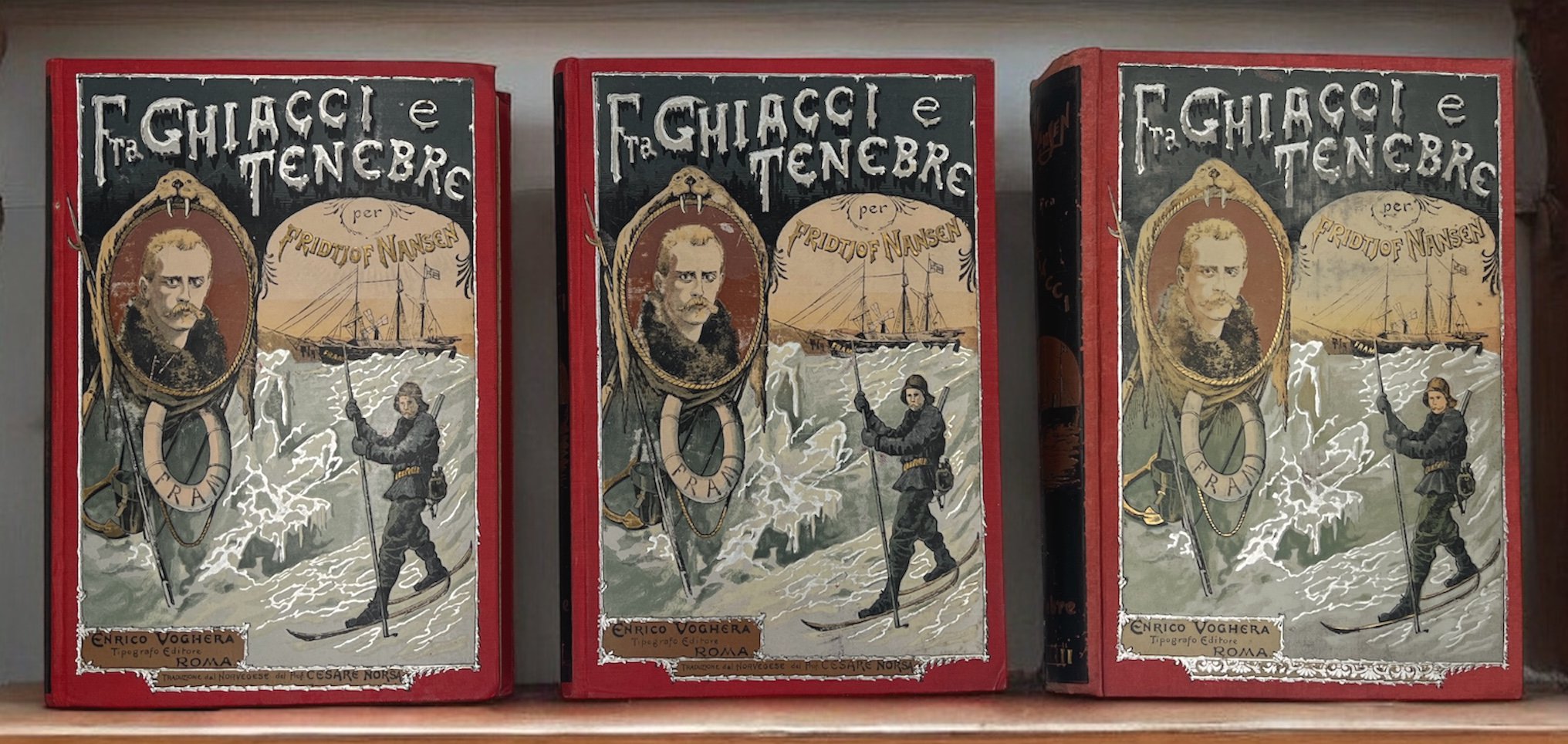 NANSEN Fridtjof e altri.Fra GHIACCI e TENEBRE. La SPEDIZIONE POLARE NORVEGESE 1893-1896.Seguita dalla RELAZIONE del CAPITANO del FRAM Otto SVERDRUP + Con NANSEN verso il POLO NORD.Roma, Voghera Enrico editore, 1900-01.Opera completa dei 3 volumi, due in seconda edizione, il 3° in prima edizione.Versione italiana dall’originale per opera di Cesare Norsa.3 spessi e stupendi volumi … Continue reading →Novità dalla Libreria Le Colonne