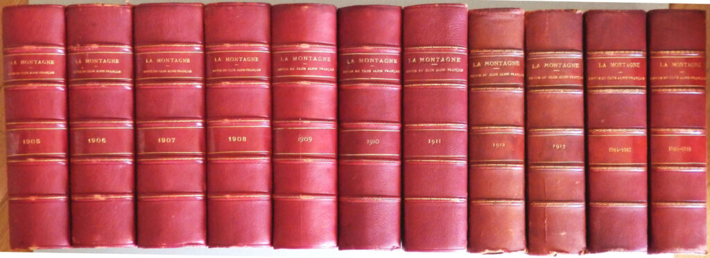Importante collezione della rivista “La Montagne” del Club Alpino Francese costituita da 14 intere annate (dal 1905 al 1918) rilegate in 11 volumi in mezza pelle con dorso a coste. Gli anni 1914 e 1915, infatti, sono entrambi rilegati in un solo tomo cosi come, anche, le annate dal 1916 al 1918. Molte le fotografie e i panorami più volte ripiegati. Si tratta delle prime annate di questa prestigiosa rivista che segue al “Bulletin et à l’Annuaire du